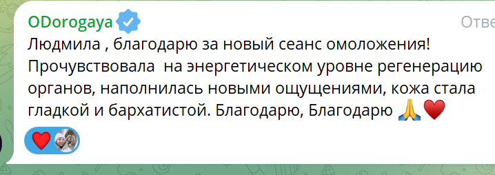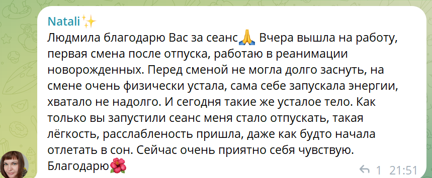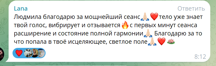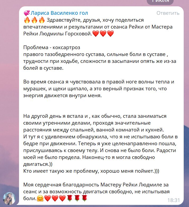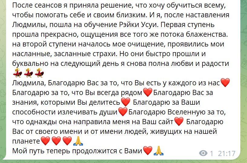 Друзья! Записалась на четыре дистанционных сеанса к Мастеру Рэйки- Людмиле Горсковой. Поверьте, мастерство настоящее!!! На сегодняшнем сеансе чувствовала мощную энергию Рэйки, ощущения незабываемые, верю! знаю о чем говорю! Эмоционально и физически новые ощущения и самочувствие! Спасибо мастеру за сеанс и помощь в исцелении!