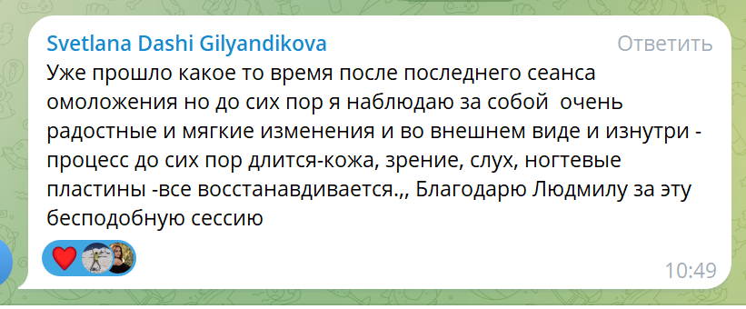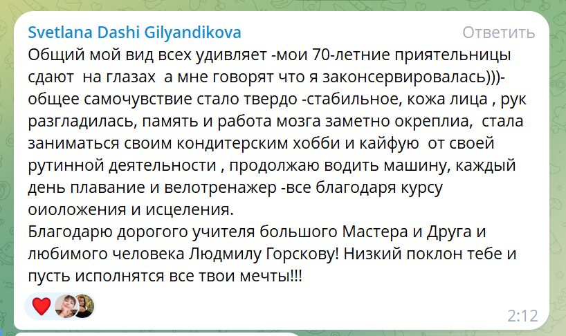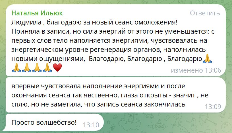 Друзья, это отзывы моих учениц, принимавших мой дистанционный онлайн курс естественного оздоровления и омоложения из 13 сеансов Световыми кодами и квантовыми энергиями Света.